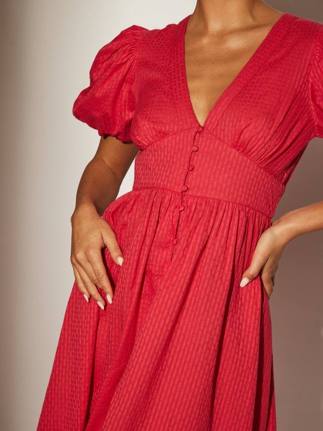 Платье миди с рукавами-фонариками и пуговицами сочетает в себе романтичные рукава-фонарики со стильными пуговицами. Длина миди и облегающий силуэт делают его универсальным и элегантным выбором как для повседневных, так и для нарядных летних мероприятий. Это платье из хлопка легкое и дышащее, идеально подходит для лета.