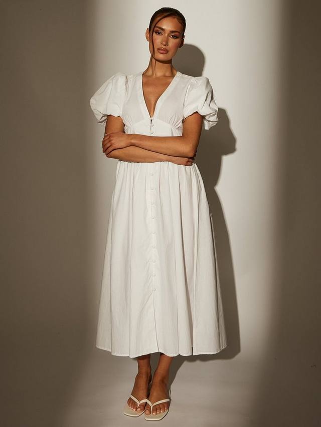 Платье миди с рукавами-фонариками и пуговицами сочетает в себе романтичные рукава-фонарики со стильными пуговицами. Длина миди и облегающий силуэт делают его универсальным и элегантным выбором как для повседневных, так и для нарядных летних мероприятий. Это платье из хлопка легкое и дышащее, идеально подходит для лета.
