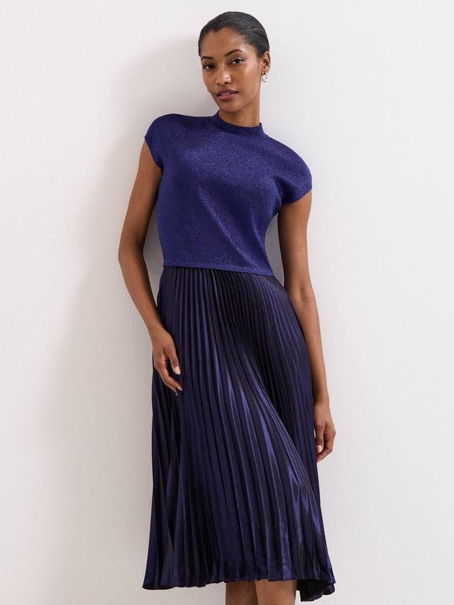 Это платье миди идеально подходит для любого случая. Трикотажный верх с рукавами-крылышками плавно переходит в плиссированную юбку миди с металлическим отливом, которая создает эффектное движение. Мерцающие детали по всей длине естественным образом отражают свет, что делает его идеальным для вечеринок. Мы дополняем наше платье серебристыми аксессуарами для создания яркого образа на мероприятии.