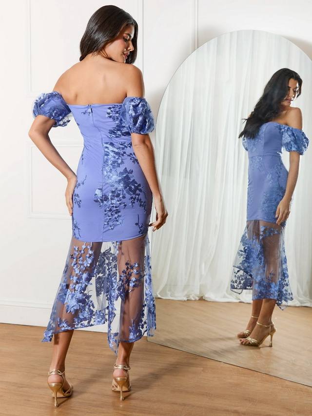 Это миди-платье от Chi Chi London с выразительным силуэтом идеально подходит для торжественных случаев. Вырез сердечком, короткие рукава-буфы с открытыми плечами и прозрачная сетчатая накладка с цветочной вышивкой, которая переходит в подол в стиле русалочьего хвоста.