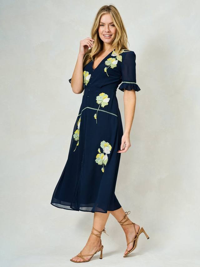 Это восхитительное платье – образец фирменного дизайна Hope & Ivy. Вышитые цветы изящно украшают бюст, талию и юбку тёмно-синего цвета, создавая изысканную элегантность, которую дополняют обтянутые пуговицы спереди. Благодаря великолепным полупрозрачным рукавам-оборкам и изысканной юбке длиной до середины голени эта модель станет незаменимой вещью для любого весеннего случая.
