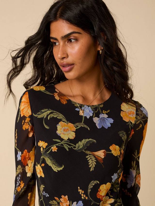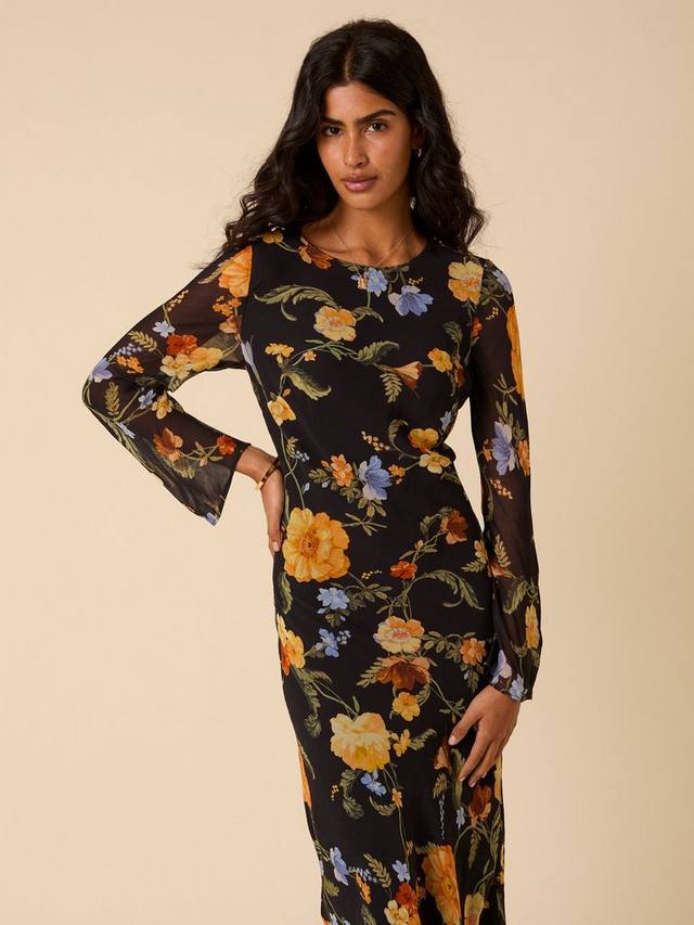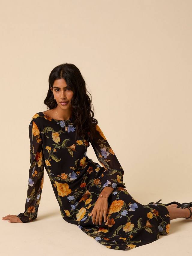 Цветочные платья навсегда. Это платье миди в черном цвете выполнено из нитей NC, гобеленовых цветочных мотивов и имеет длинные гофрированные рукава. Нам нравится ее облегающий крой за его непринужденность.