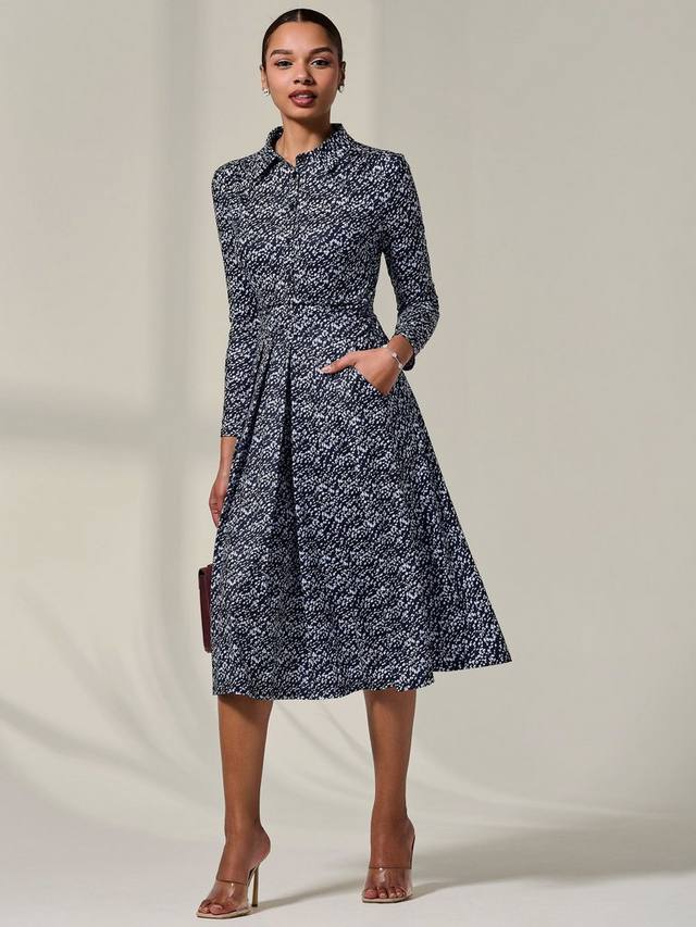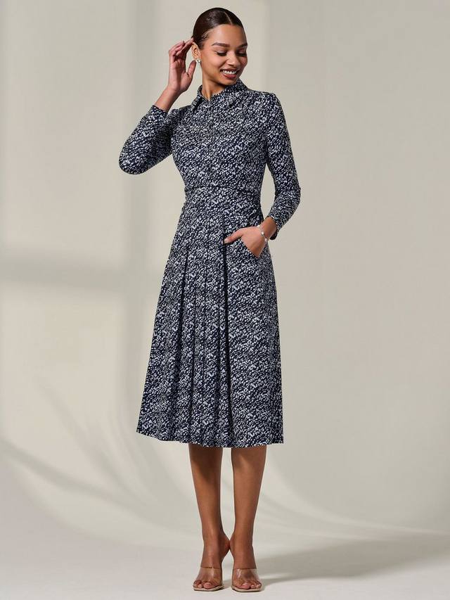 Почувствуйте себя шикарно в этом темно-синем платье миди на пуговицах от Jolie Moi – идеальном базовом предмете гардероба для летнего офиса. Трикотаж с цветочным принтом дополнен деталями на пуговицах и стильным воротником, которые придают изысканность этой удобной повседневной модели. Платье также имеет классический лиф с рюшами, который подходит любому типу фигуры, и завязывающийся сзади пояс. Плиссированная юбка идеальной длины миди с карманами для практичности.