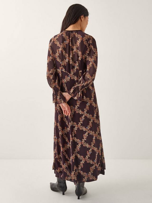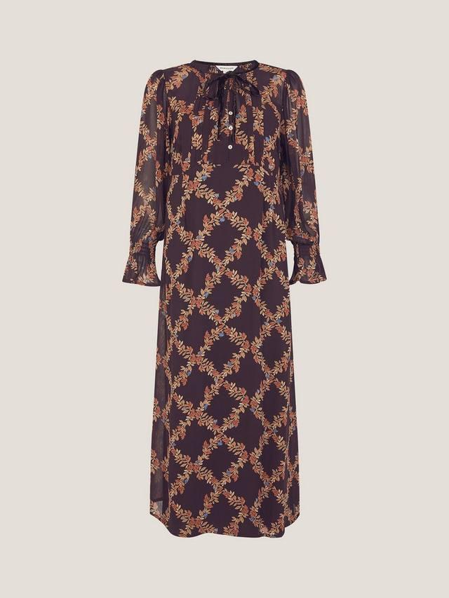 Классический А-силуэт с оборками и текстурой. Это платье миди с длинными рукавами от Monsoon, круглым вырезом и цветочным узором.