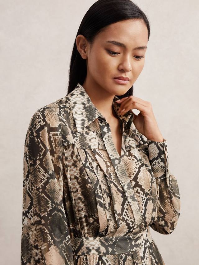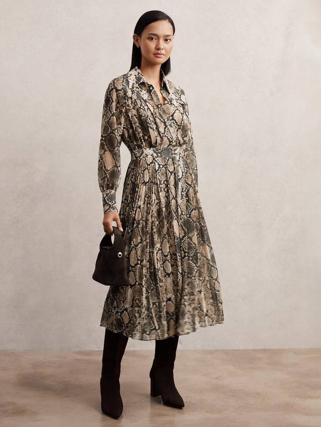 Платье-рубашка миди с плиссировкой, узором змея и изящным воротником. Классический крой обеспечит комфорт на встречах и в повседневной жизни.