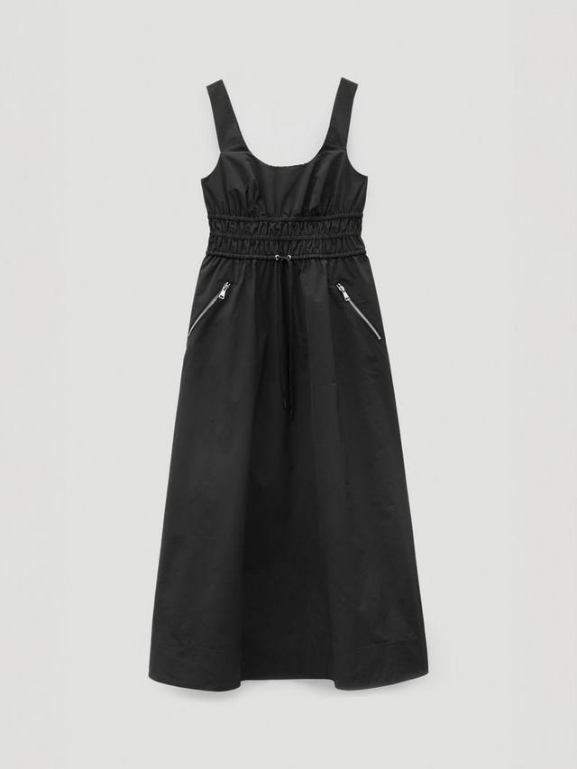 Идеальное чёрное платье в современном исполнении. Удлинённый подол обеспечивает комфортную посадку, а многоярусные сборки создают естественно очерченную, но при этом комфортную талию. Широкие бретели позволяют носить платье с бюстгальтером, а два кармана на молнии делают его ещё более практичным, делая его универсальной и незаменимой вещью в любом гардеробе.