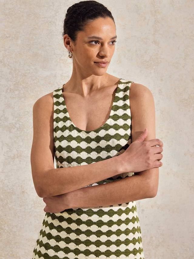 Это платье миди без рукавов от Ro&Zo, выполненное из мягкой эластичной смесовой ткани с геометрическими полосками, имеет округлый вырез и А-силуэт.