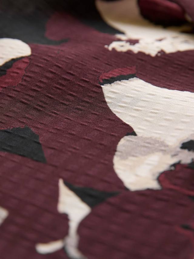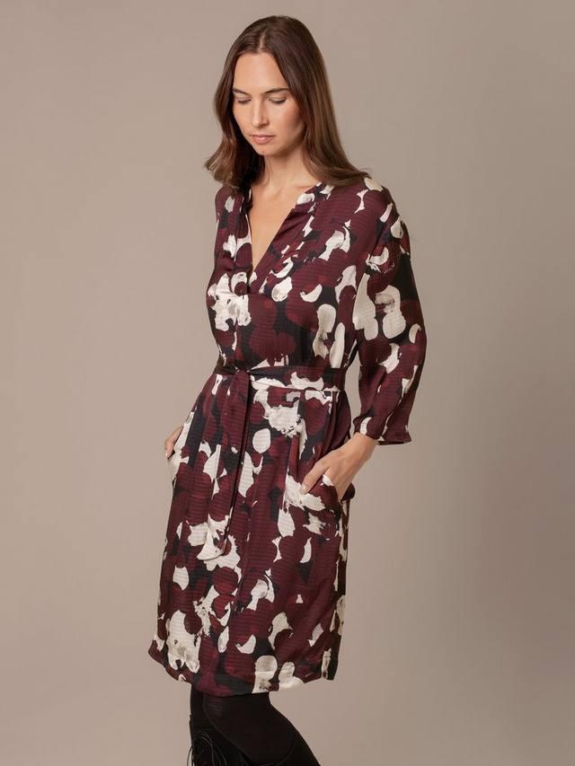 Это платье с драпировкой выполнено из лёгкой вискозы и украшено принтом в виде неровных пятен, создающим изящную детализацию. Платье имеет вырез без воротника и рукава длиной до браслета. В комплекте пояс на завязке, который мягко корректирует силуэт.