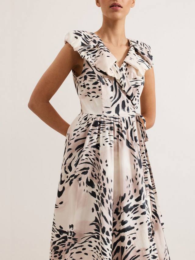 Новый нейтральный цвет: леопардовый принт. Платье-халат Trix украшено красивыми оборками на вырезе и плечах, плавно переходящими в мягкую юбку миди, обеспечивающую плавность движений. Дополненное соответствующими аксессуарами, это идеальный современный образ, который можно носить как днем, так и вечером.