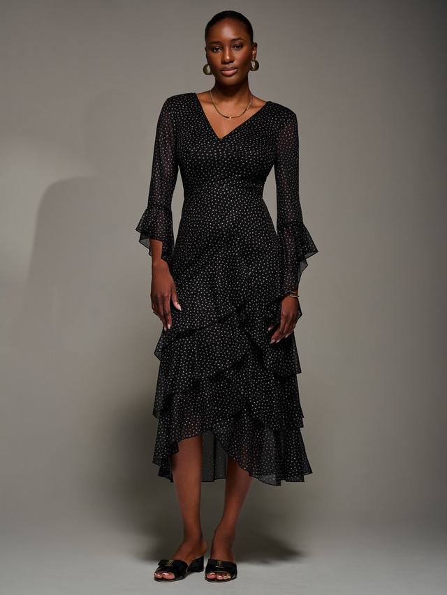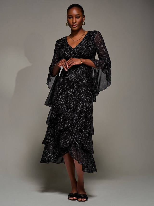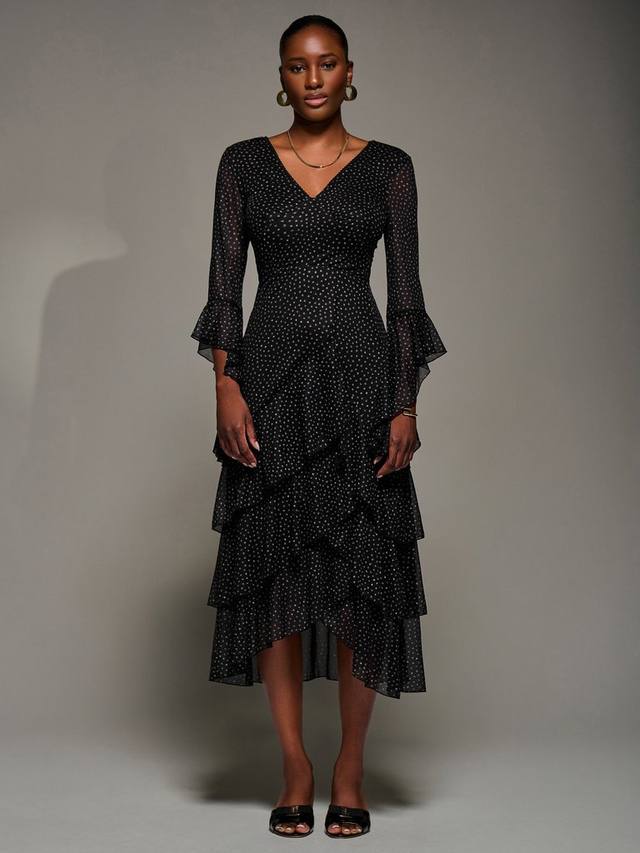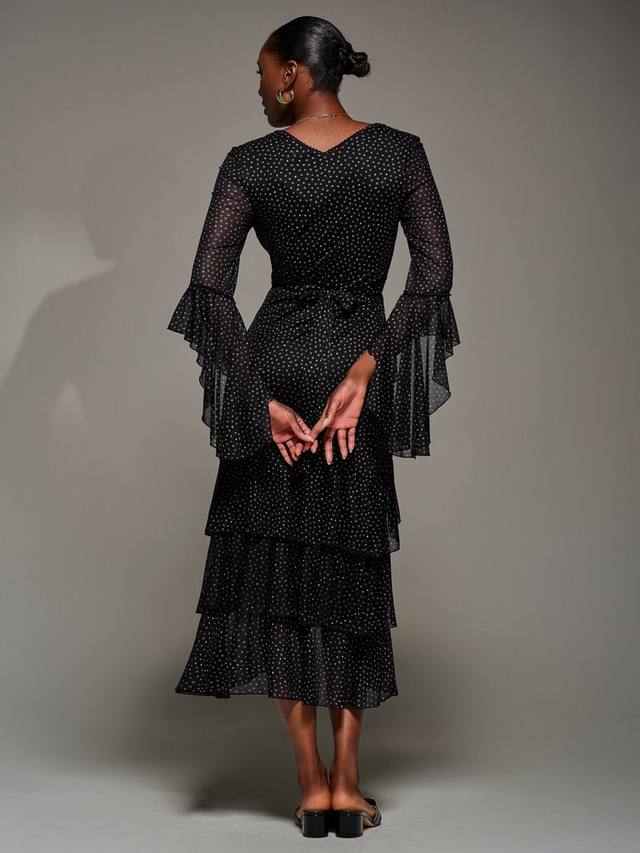 Непринужденно романтичное платье-сетка с оборками воплощает суть утонченной женственности благодаря приглушённому цветочному принту и мягким, струящимся ярусам. Мягкий V-образный вырез красиво обрамляет зону декольте, а вставки на талии создают естественный, изящный силуэт. Длинные многоярусные рукава-крылышки добавляют грациозности и мечтательности, притягивая взгляд. Многоярусная юбка макси с оборками элегантно струится при каждом шаге, создавая очаровательный образ. Пояс в тон идеально подчеркивает фигуру. Создано для особых моментов, когда вы хотите чувствовать себя одновременно потрясающе и непринужденно шикарно.