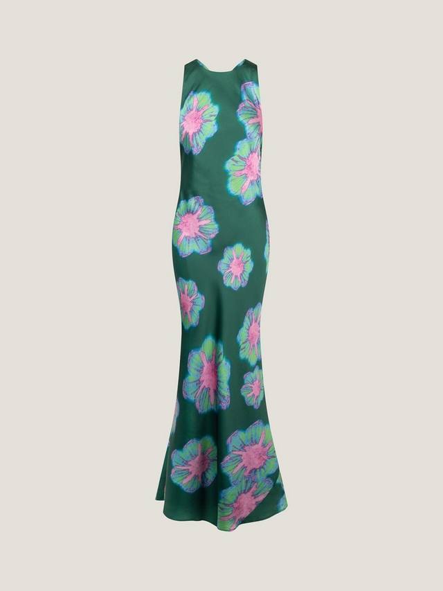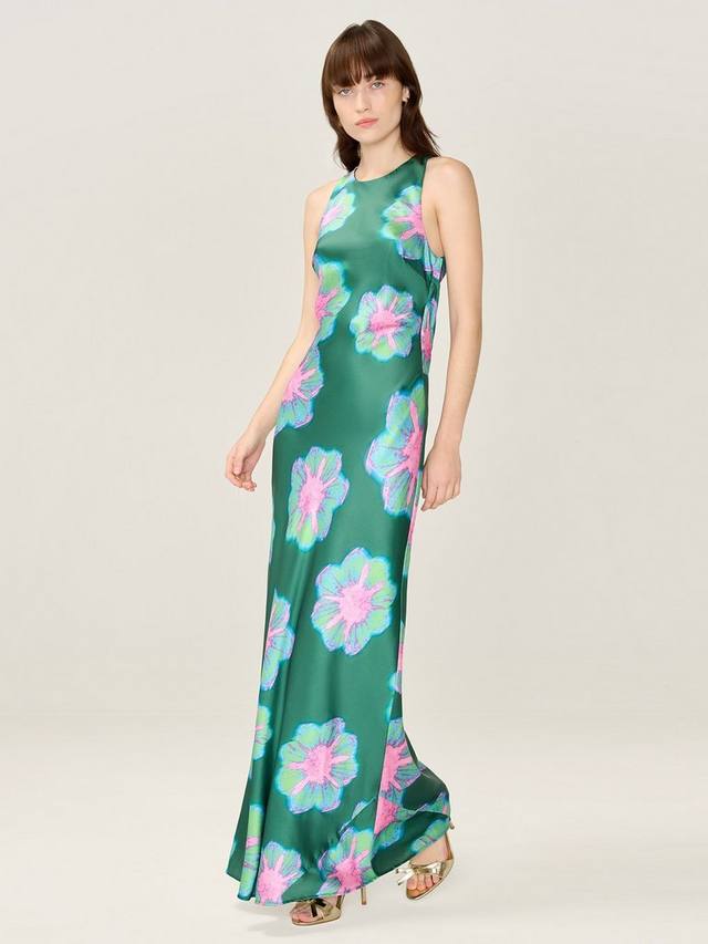 Jai попадает в точку. Высокий ворот и открытая спина с глубоким вырезом и перекрещивающимися бретелями. Изготовлено из атласа с крупным размытым цветочным узором.