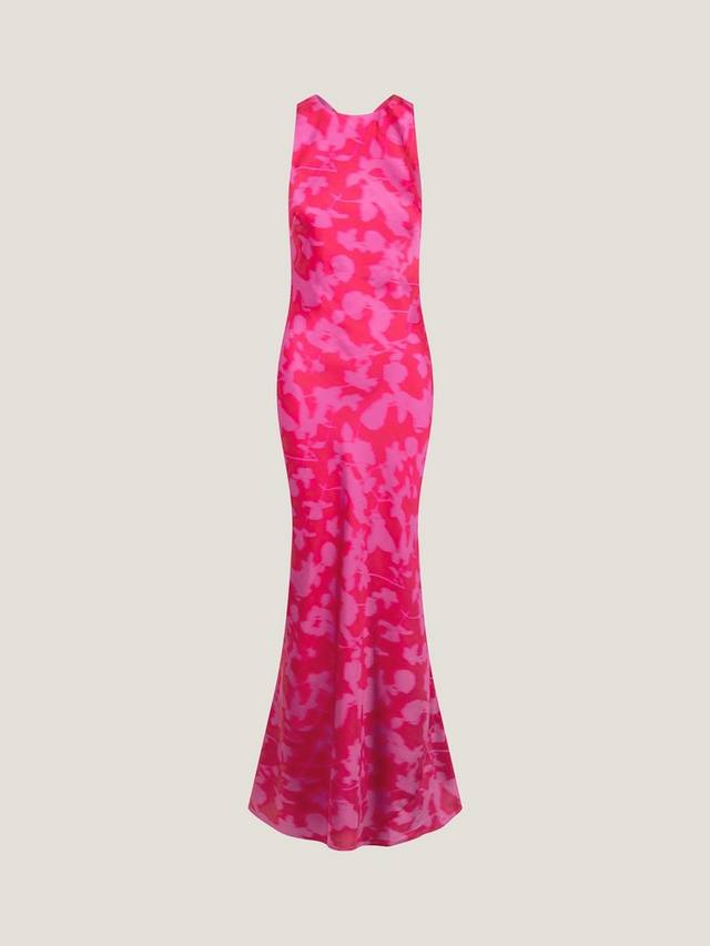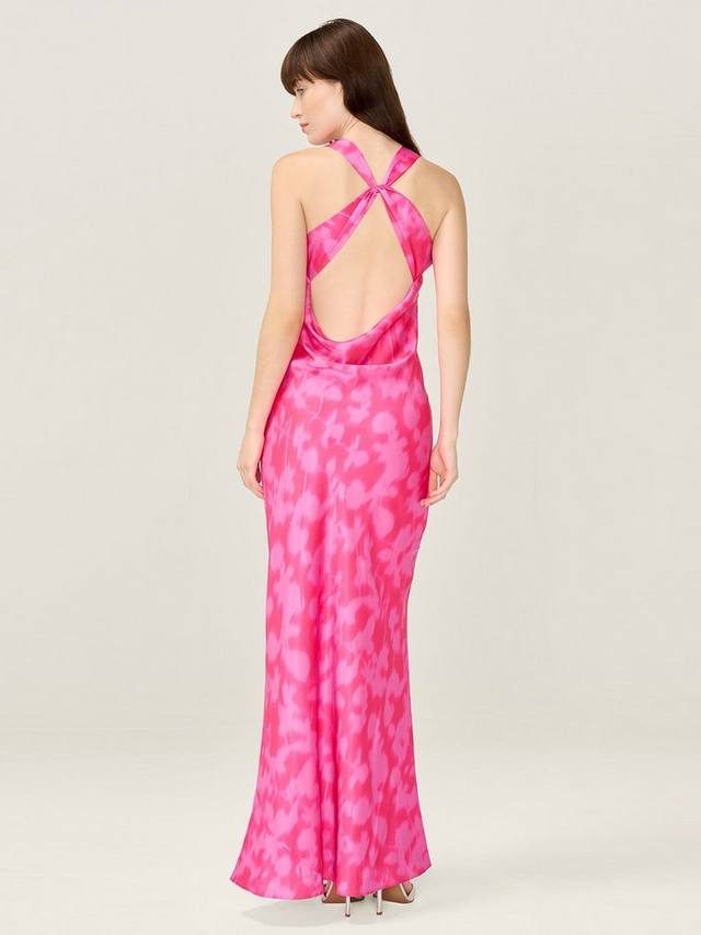Jai попадает в точку. Высокий ворот и открытая спина с глубоким вырезом и перекрещивающимися бретелями. Платье выполнено из атласа с крупным размытым цветочным рисунком.