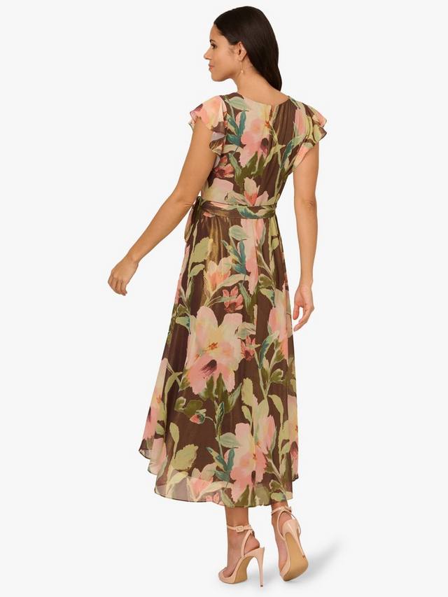 Это платье выполнено из воздушного шифона с цветочным принтом, создавая легкий и изящный образ, идеально подходящий для любого особого случая. Расклешенные рукава и лиф с имитацией запаха и выгодно завязанным поясом на талии формируют мягкий А-силуэт, а юбка с асимметричным лифом, отделанная изящной оборкой, добавляет плавности движения. Незаметная застежка-молния сзади обеспечивает гладкую посадку, делая эту модель идеальным выбором для садовых вечеринок, детских праздников и дневных торжеств.