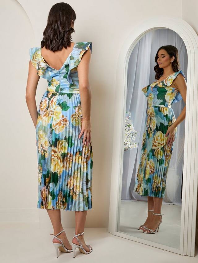 Это миди-платье от Chi Chi London, демонстрирующее любовь к плиссировке, идеально подходит для летних мероприятий. Платье с квадратным вырезом, отделанным оборкой, и рукавами-крылышками украшено цветочным принтом в сине-желтых тонах.