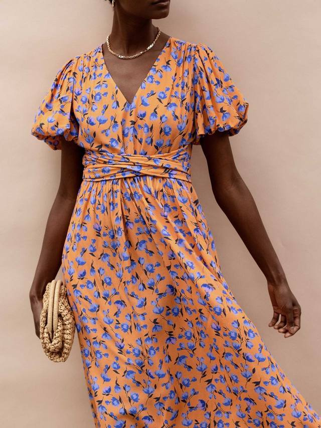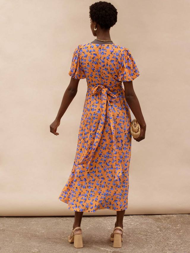 Это макси-платье от Ro&Zo, которое легко подчеркивает фигуру благодаря расклешенному крою и свободному крою, выполнено из воздушной вискозной ткани. V-образный вырез, присборенная талия и короткие рукава-фонарики украшены цветочным принтом.