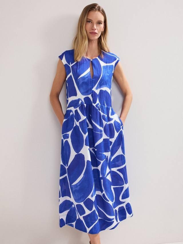 Это непринужденное платье мидаси украшено эффектным принтом в виде листьев, создающим современный образ, и дополнено простой деталью с пуговицами на вырезе. В сочетании с вашей любимой обувью и аксессуарами это платье легко и универсально, как для дня, так и для вечера.