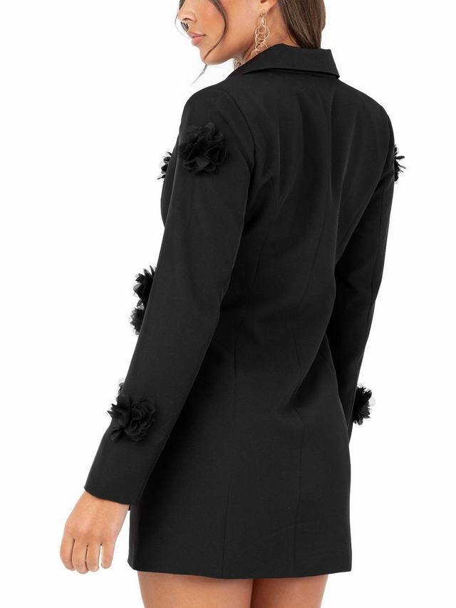 Это платье-блейзер с заостренными лацканами, V-образным вырезом, подкладками на плечах, приталенной талией и объемными сетчатыми цветами воплощает изысканную элегантность. Золотые акценты и элегантная обувь создают непринужденную элегантность.