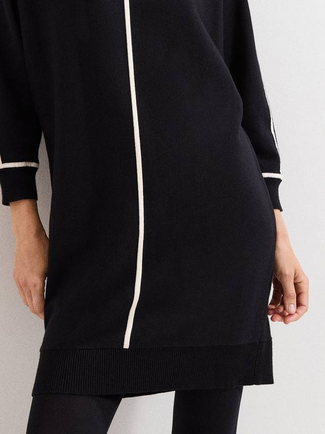 Вязаное мини-платье – незаменимый аксессуар осенью и зимой. Эта версия дополнена воротником-трубой и контрастной отделкой для создания современного образа. А-образный силуэт идеально сочетается с вашими любимыми колготками и ботинками как днем, так и вечером.