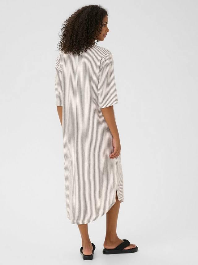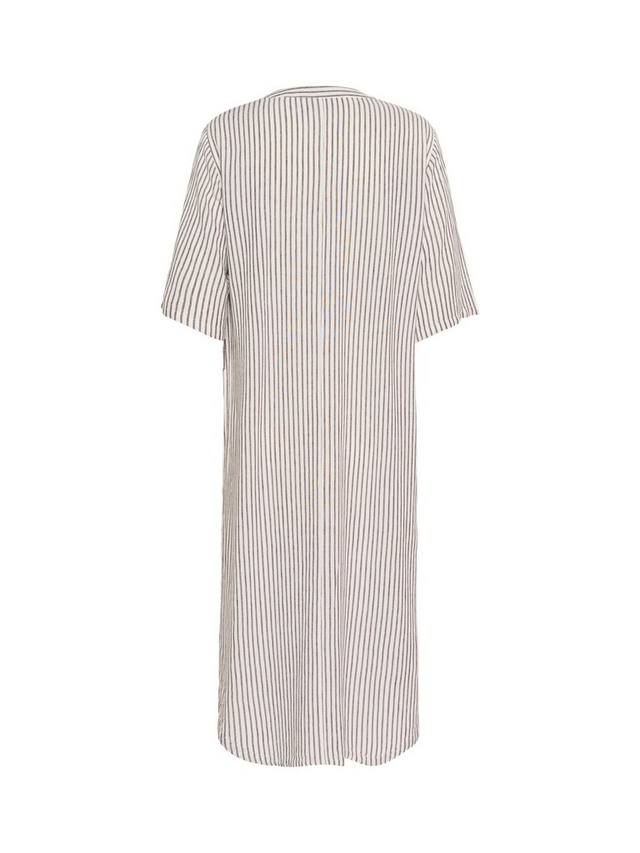 Это платье-кафтан средней длины от KAFFE, удобное в носке, выполнено из воздушной вискозной ткани в стиле туники. V-образный вырез и короткие рукава обеспечивают свободный крой и элегантный узор в меловую/ирисную полоску.