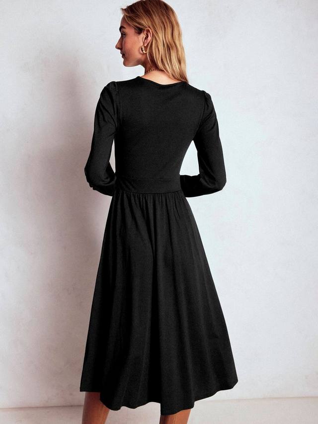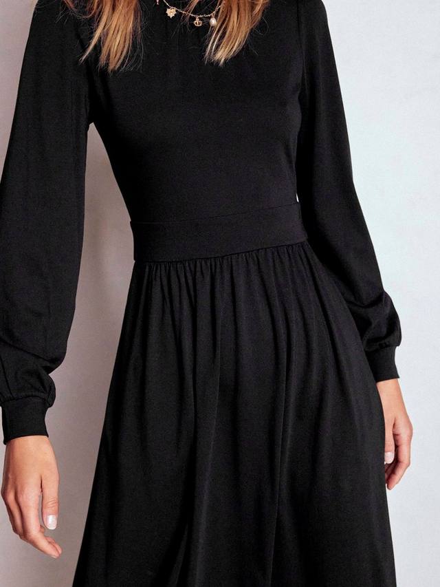 Это облегающее и расклешенное трикотажное платье миди обеспечит вам комфорт и уверенность в себе на весь день. Классический круглый вырез и длинные рукава обеспечивают удобство, а хлопковая смесь с добавлением эластичности обеспечивает максимальный комфорт.