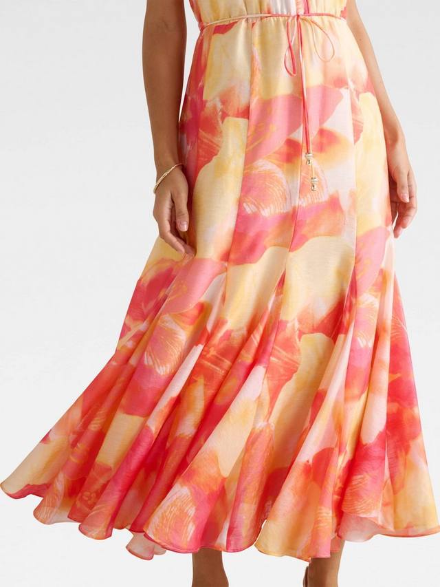 Приталенное и расклешенное платье миди от Forever New переосмысливает оборки и абстрактные узоры. Дизайн с американской проймой гармонично сочетает комфорт и стиль, а продуманный крой и отделка годе формируют изысканный, но игривый силуэт.
