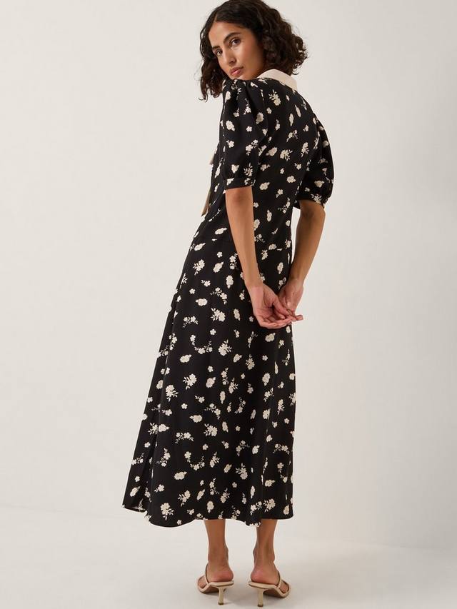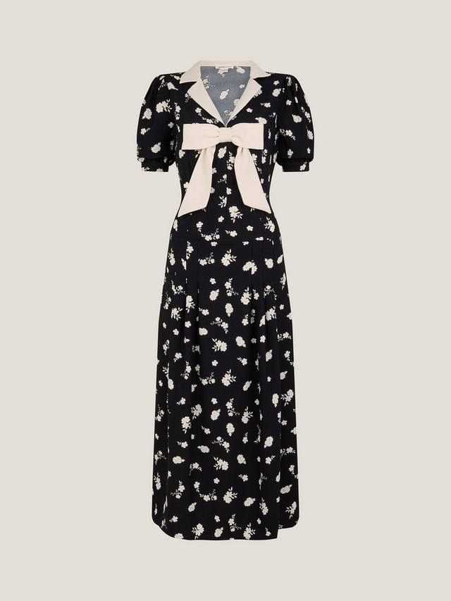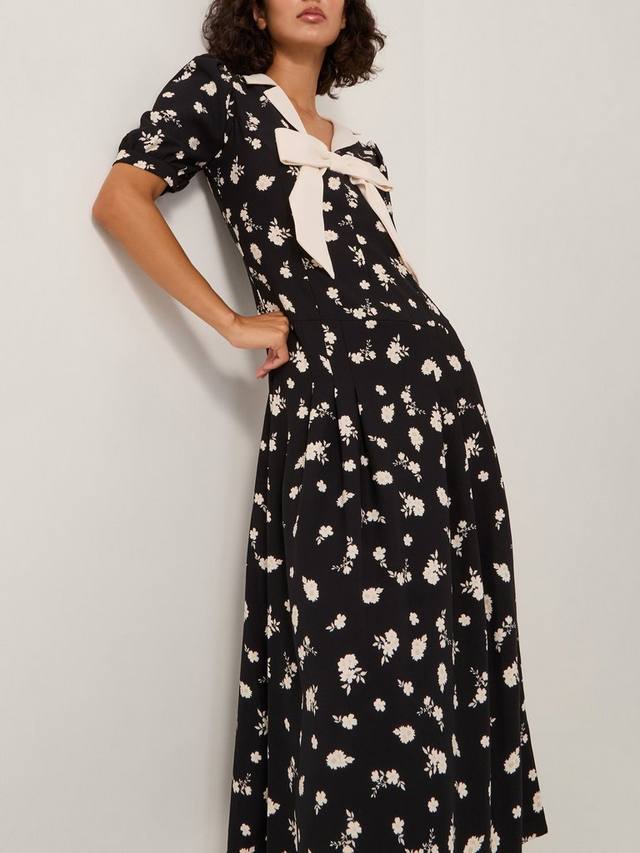 Это платье, украшенное цветочным узором, имеет воротник-стойку, короткие рукава-фонарики и подол миди. Спереди оно украшено эффектным бантом.
