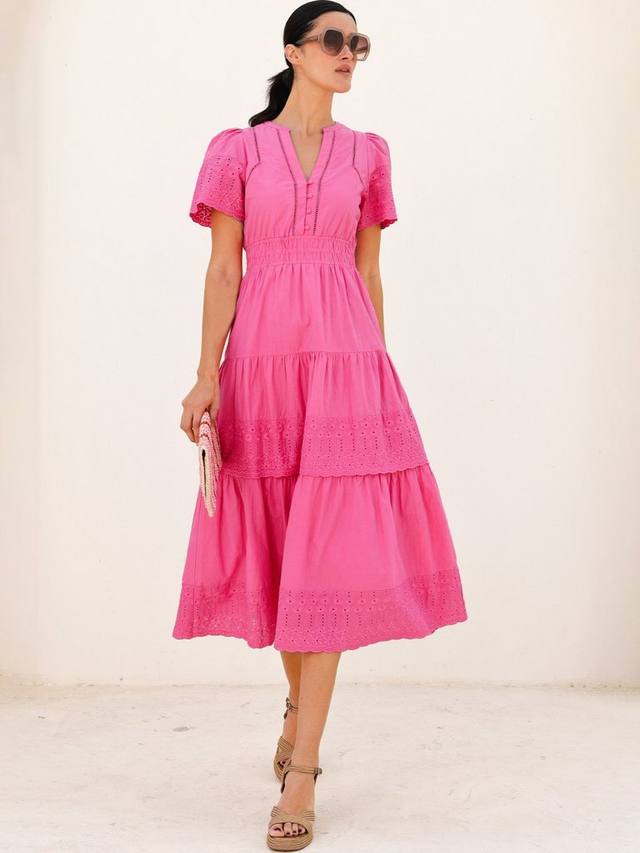 Это платье миди добавит игривой элегантности вашим дневным выходам. Многоуровневый А-образный крой не стесняет движений, а мягкая вышивка ришелье добавляет текстуру. Короткие рукава и V-образный вырез обеспечивают прохладу и комфорт, позволяя вам чувствовать себя уверенно весь день.