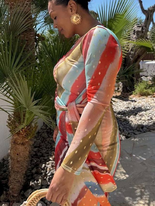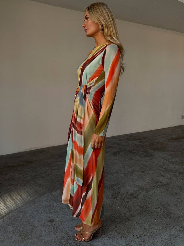 Мягкая шелковистая сетка с великолепным разноцветным полосатым принтом, облегающим изгибы и доходящим до щиколотки. Платье полностью на подкладке, с прозрачными рукавами, что добавляет нотку сексуальности, и с завязкой, которая стягивает талию, создавая более изящный силуэт!