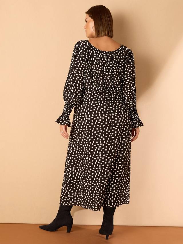 Ощутите непринужденное очарование этого платья молочница с присборенным вырезом и подчеркнутой частично эластичной талией для комфортной посадки. Длина миди и длинные рукава с присборенными деталями добавляют утонченности и женственности, а удобная конструкция без застежки делает его идеальным вариантом для повседневной носки.