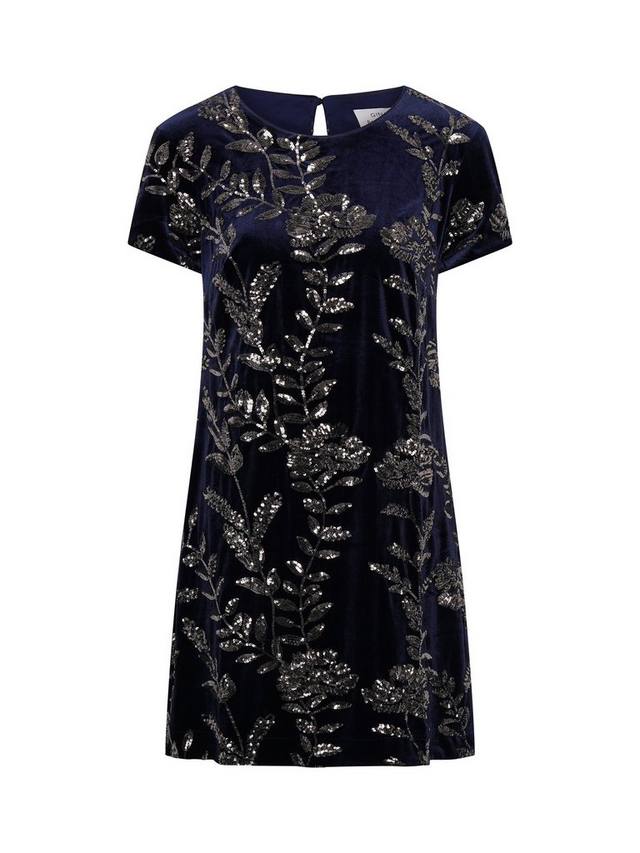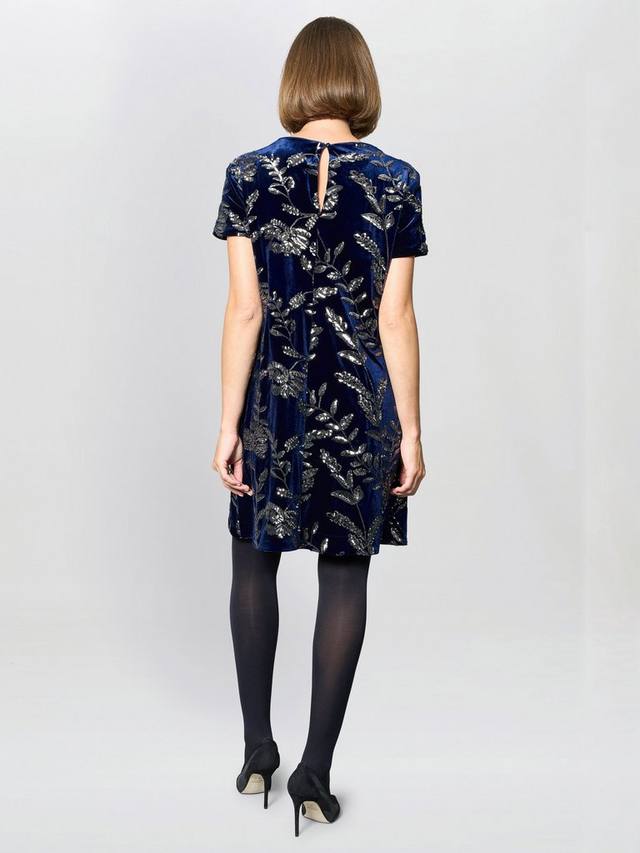 Излучайте вневременной гламур в платье Cleopatra. Это платье-трапеция с короткими рукавами, выполненное из темно-синего бархата, украшено вышивкой в виде металлических листьев, мерцающих при каждом движении. Простой силуэт обеспечивает комфорт и изысканность, делая его идеальным выбором для коктейльных вечеринок, фестивалей или элегантных вечерних выходов.