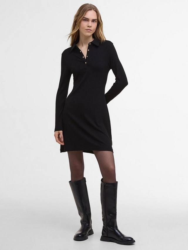 Нет никаких сомнений в том, что маленькое черное платье — это базовый предмет гардероба, но мини-платье Chloe Ribbed от Barbour International выводит этот стиль на новый уровень. Это мини-платье с длинными рукавами, выполненное из эластичного ребристого джерси, подчеркивает фигуру и дополнено яркими золотистыми фирменными пуговицами и отложным воротником.