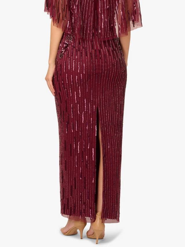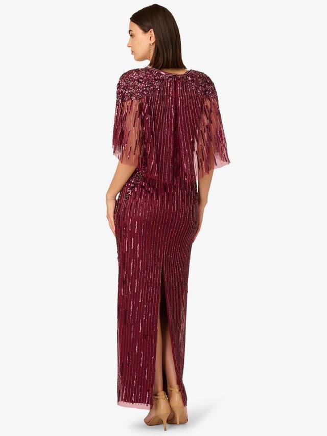 Это элегантное платье поражает своим силуэтом прямоугольник и прозрачной накидкой, которая добавляет грациозности движению и прикрывает фигуру. Вырез лодочка обрамляет лицо, а сплошная расшитая вручную бисерная отделка мерцает вертикальными линиями, удлиняя фигуру. Изящная цветочная вышивка бисером на плечах и талии создает едва заметный акцент, делая это платье роскошным выбором для официальных вечеров и мероприятий в стиле черный галстук.