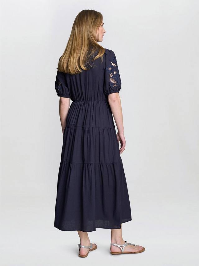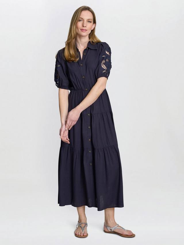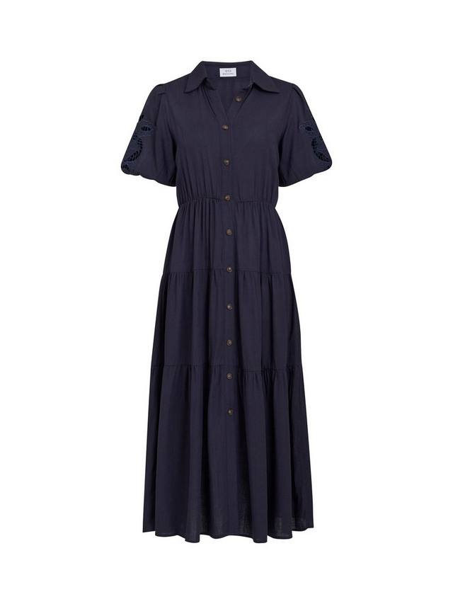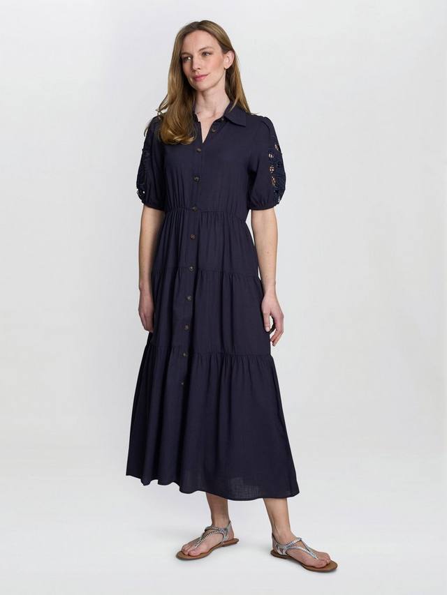 Это платье-рубашка на пуговицах от Gina Bacconi стильное и удобное. Рукава-фонарики с вышивкой бродери англез добавляют изящности и женственности, а многоярусная юбка придает платью игривый, струящийся вид. Эластичный пояс обеспечивает удобную посадку, а дышащая ткань делает его идеальным для теплых дней и вечеров.