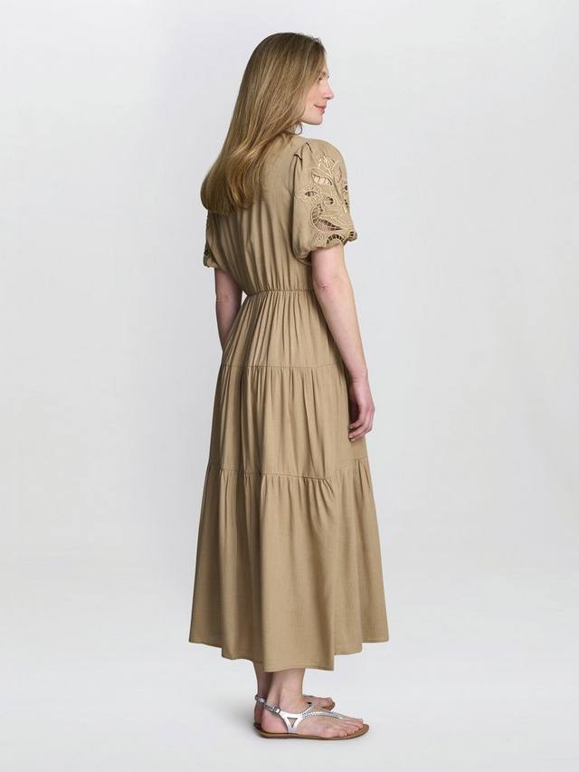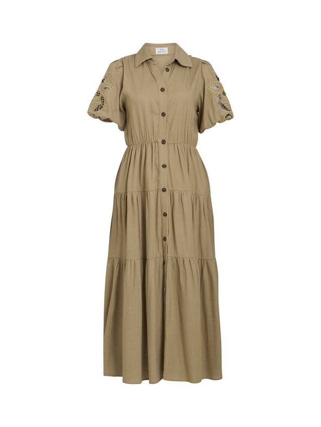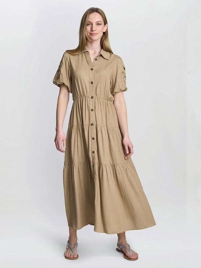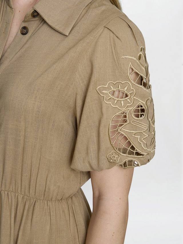 Это платье-рубашка на пуговицах от Gina Bacconi стильное и удобное. Рукава-фонарики с вышивкой бродери англез добавляют изящности и женственности, а многоярусная юбка придает платью игривый, струящийся вид. Эластичный пояс обеспечивает удобную посадку, а дышащая ткань делает его идеальным для теплых дней и вечеров.
