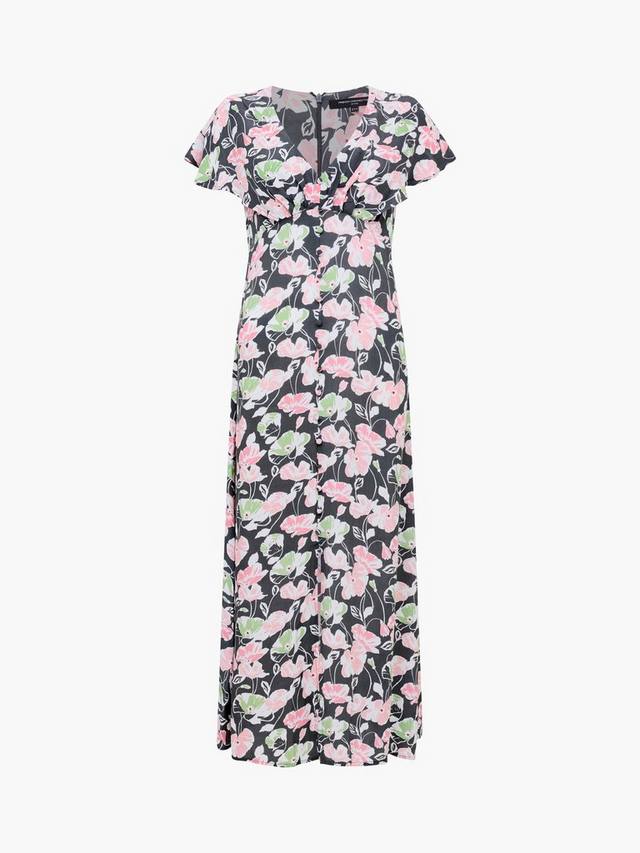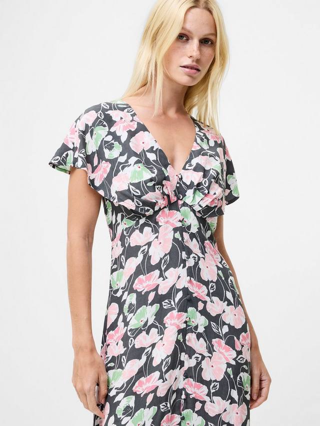 Это платье-рубашка с цветочным принтом из мягкой вискозы и свободного силуэта миди идеально подходит для насыщенных дней. Глубокий вырез, развевающиеся рукава-накидки и подходящие декоративные пуговицы придадут вам уверенности и комфорта, будь то встреча с друзьями или тихая прогулка.