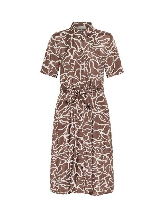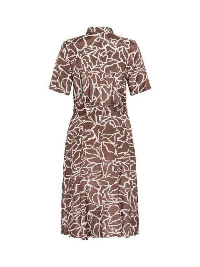 Это платье длиной до колена от KAFFE, скроенное по фасону рубашки с расклешенным подолом, выполнено из лёгкой вискозы. Воротник-стойка и короткие рукава, а абстрактный принт — центральное место в гардеробе.