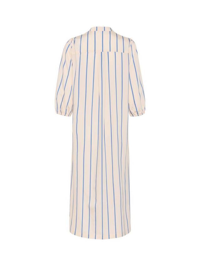 Это элегантное платье миди из Сен-Тропе, выполненное в стиле рубашки, выполнено из лёгкой смесовой вискозы. Оно имеет воротник-стойку и рукава три четверти, а также украшено контрастными полосками.