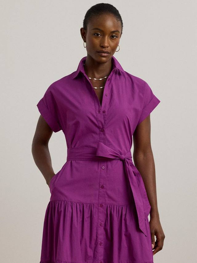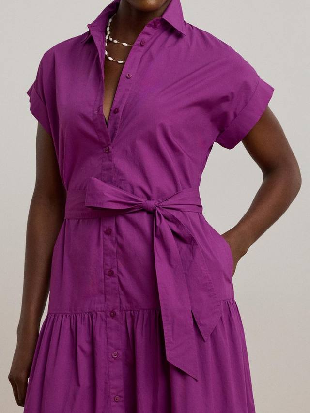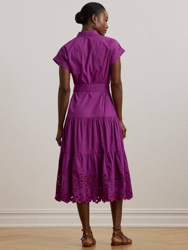 Струящаяся многоярусная юбка и вышивка на люверсах придают женственность этому платью-рубашке с короткими рукавами, сшитому из лёгкого хлопкового сукна. Подвёрнутые манжеты и пояс на талии завершают образ.
