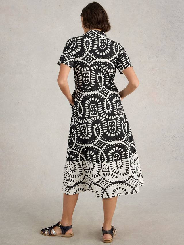 Это платье миди от White Stuff, классический фасон, на который можно положиться снова и снова, выполнено из органического хлопка. Элегантный воротник и короткие рукава притягивают взгляд абстрактным принтом.