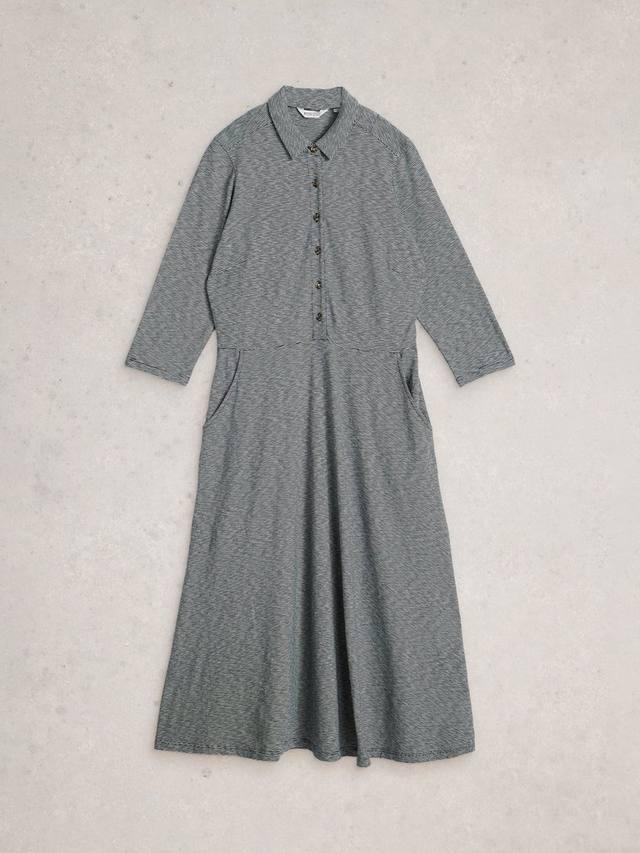 Каждой коллекции нужно платье на любой сезон. Яркий пример — это миди-платье от White Stuff из хлопковой смесовой ткани. Удобный крой с воротником и короткими рукавами визуально подчеркивается полосками.