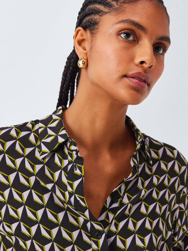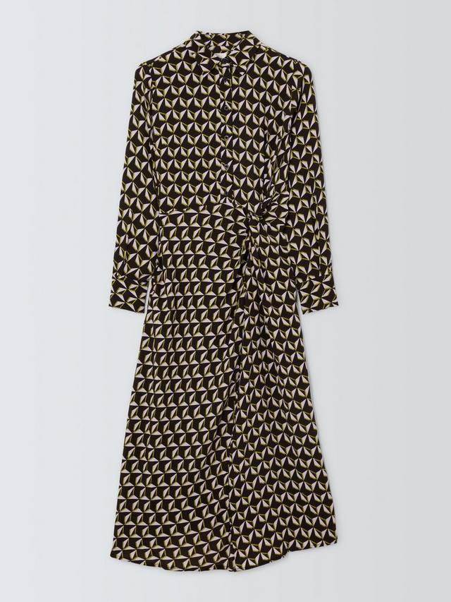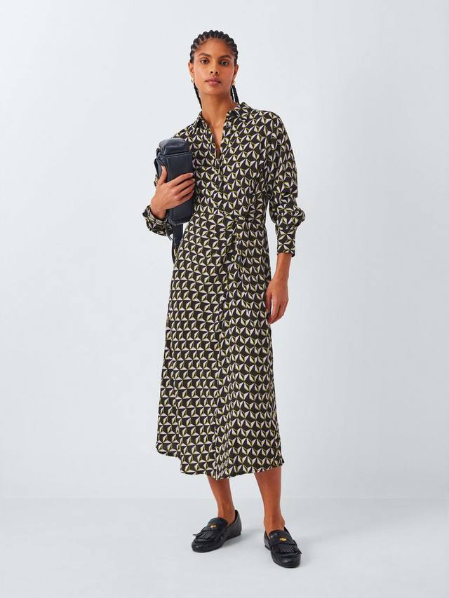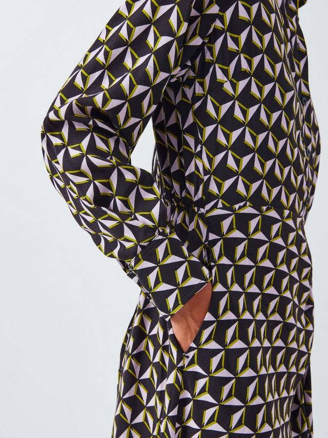 Платье-рубашка с геометрическим принтом, выполненное из струящейся ткани, длиной миди. Модель с воротником, застежкой на пуговицы до талии, боковыми карманами и рукавами до локтя.