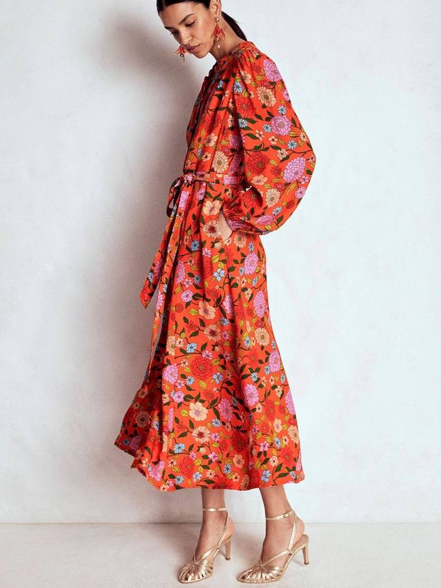 Легкий, застёгнутый на все пуговицы. Это миди-платье от Boden с длинными рукавами и простым круглым вырезом украшено цветочным принтом, который актуален в любое время года.
