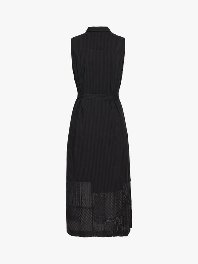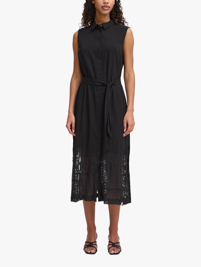 Это удобное платье миди от ICHI, выполненное в классическом рубашечном стиле с кружевным подолом, сшито из смесовой ткани с добавлением хлопка. Модель без рукавов украшена элегантным воротничком, а также принтом в виде тонкой вертикальной полоски. Платье завязывается на талии поясом.