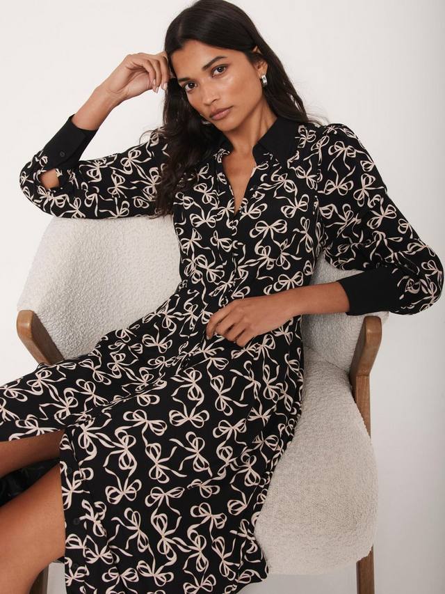 Платье-рубашка с бантом, силуэта миди, с контрастным классическим воротником, длинными рукавами, манжетами на пуговицах и потайной застежкой на пуговицы спереди.
