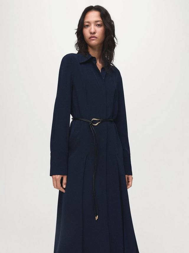 Незаменимая вещь в любом гардеробе. Это платье миди от Mango с длинными рукавами, воротником и простым кроем, которое подходит ко всему.
