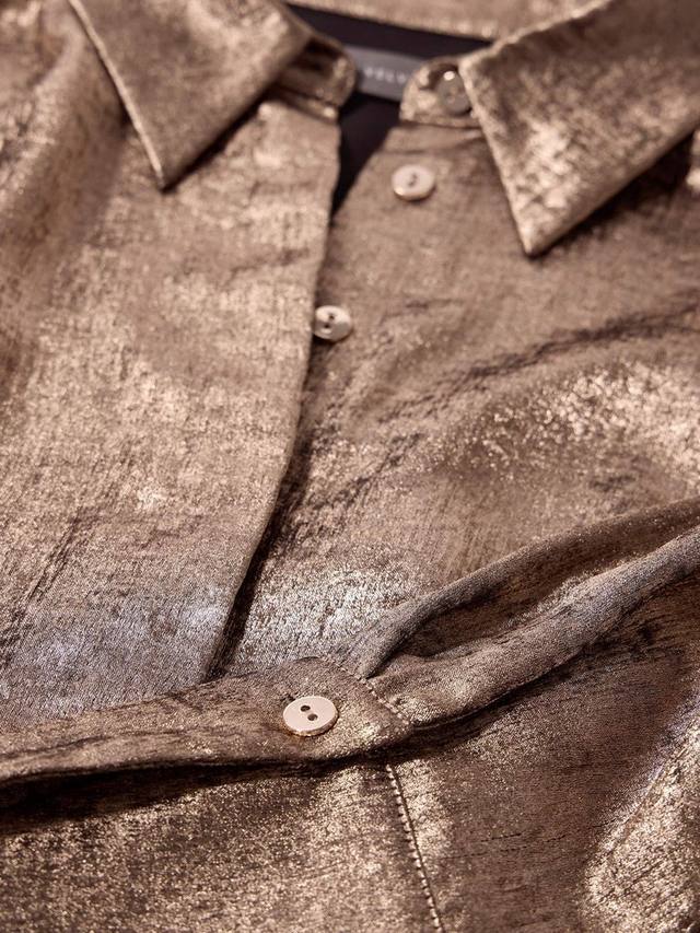 Платье-рубашка цвета золота с металлическим отливом, силуэта миди, с классическим воротником, длинными рукавами, манжетами на пуговицах, асимметричным подолом и потайной застежкой на пуговицы спереди.