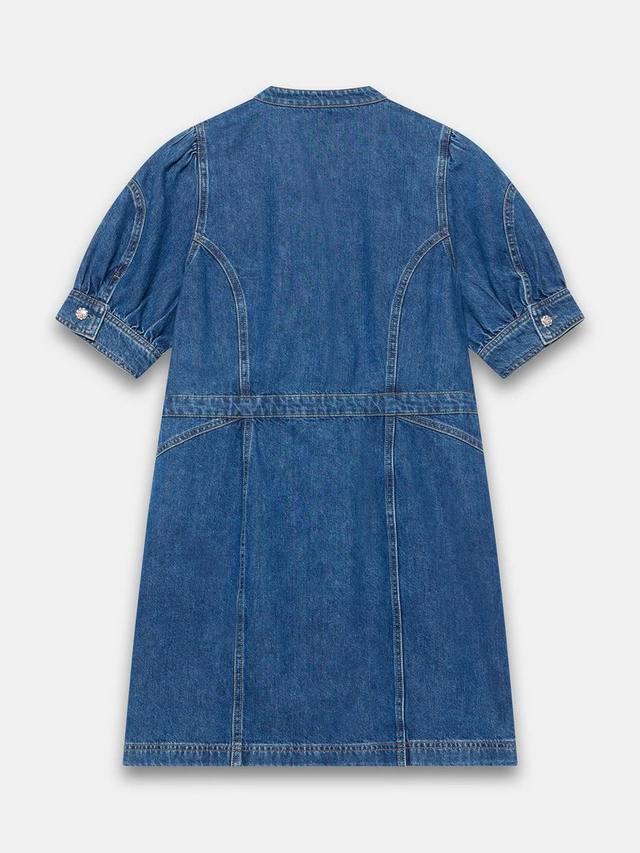 Платье из денима цвета индиго с мини-силуэтом, круглым вырезом, короткими рукавами-буфами, нагрудными карманами, боковыми карманами и застежкой на пуговицы, украшенные кристаллами, спереди.