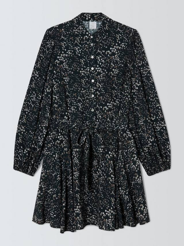 Мини-платье-рубашка в крапинку из легкой ткани с поясом на завязке.