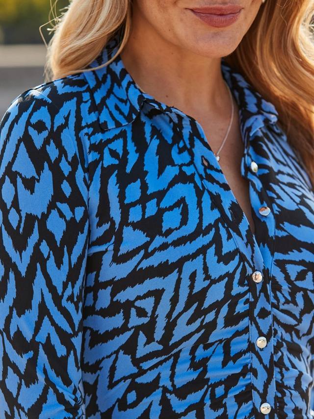 Это платье-рубашка миди с рюшами, абстрактным узором и классическим воротником. Приталенный крой подчеркивает фигуру, а длинные рукава обеспечат комфорт как от утренних встреч, так и от планов на выходные.