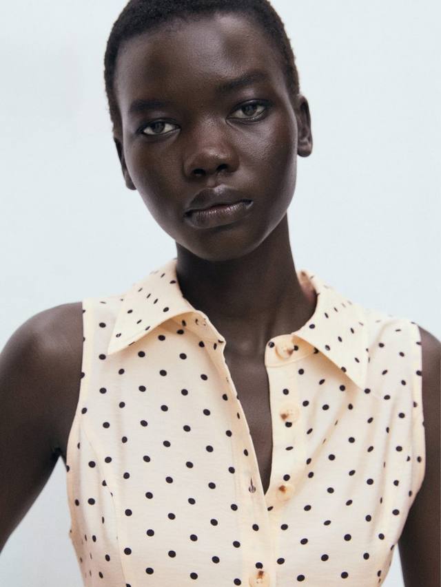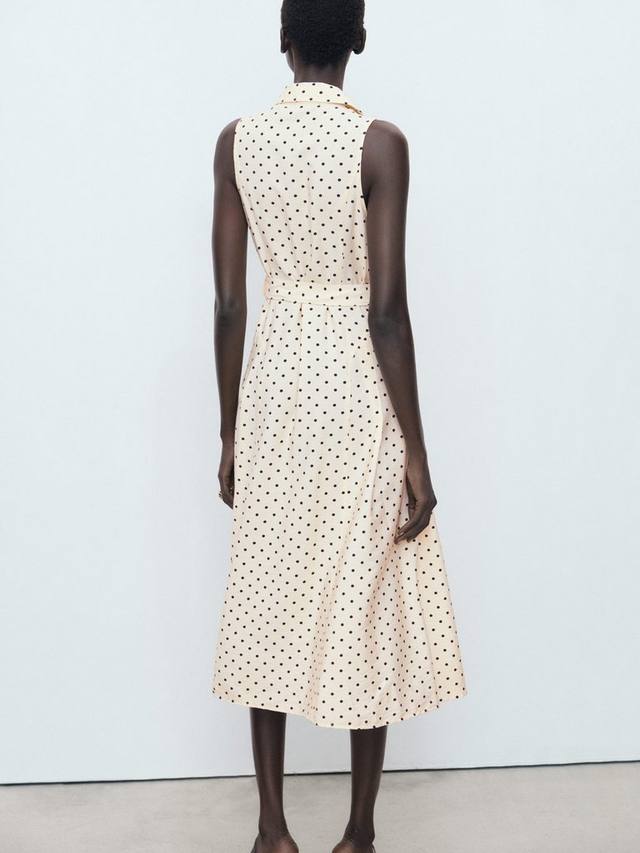 Это платье-рубашка с принтом в горошек обеспечит вам прохладу и комфорт, а продуманный воротник и длина миди создадут элегантный образ, идеально подходящий для повседневных дел или летних встреч. Крой без рукавов позволит вам свободно двигаться, куда бы вы ни отправились.